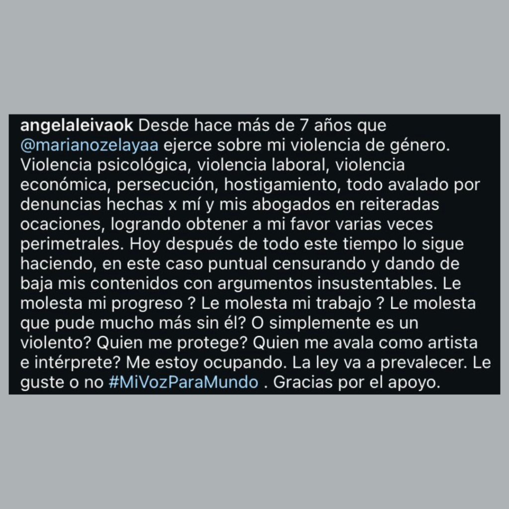 “Desde hace más de 7 años que @marianozelayaa ejerce sobre mí violencia de género. Violencia psicológica, violencia laboral, violencia económica, persecución, hostigamiento, todo avalado por denuncias hechas por mí y mis abogados en reiteradas ocasiones, logrando obtener a mi favor varias veces perimetrales”, denunció Leiva.