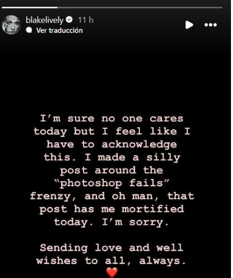 En una publicación en sus redes sociales, Lively compartió una foto de ella misma en una piscina con errores evidentes de edición y escribió: “¡Estoy muy emocionada de compartir esta nueva foto que acabo de sacarme hoy para anunciar nuestros 4 nuevos productos. Ahora sabéis por qué he estado desaparecida”. Sin embargo, después de que se conociera el diagnóstico de cáncer de Middleton, Lively se disculpó públicamente por su comentario anterior.