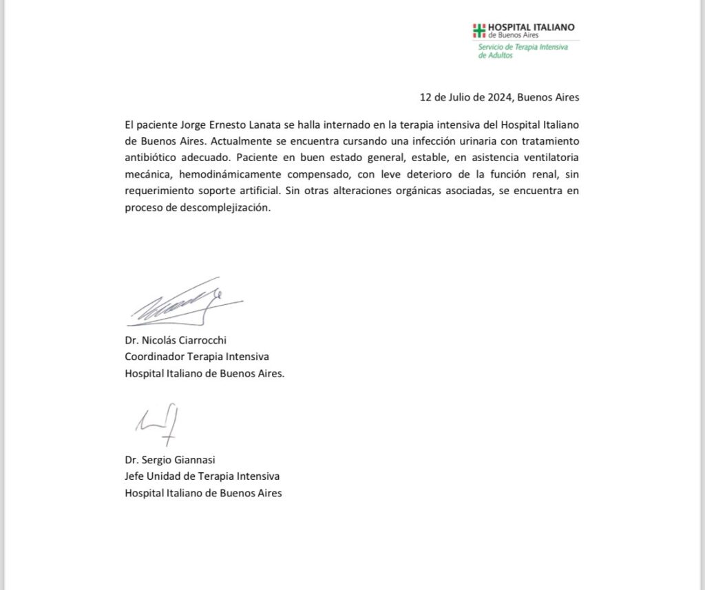El informe médico sugiere que, a pesar de las complicaciones, su condición es estable y está siendo adecuadamente gestionada por el equipo médico del Hospital Italiano.