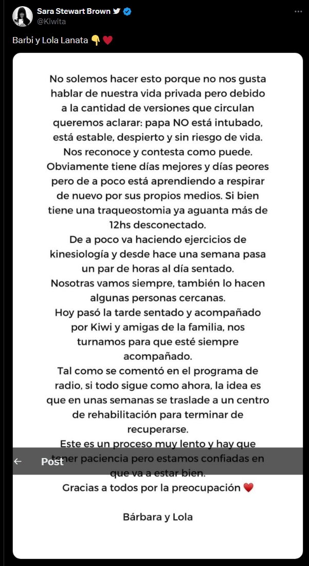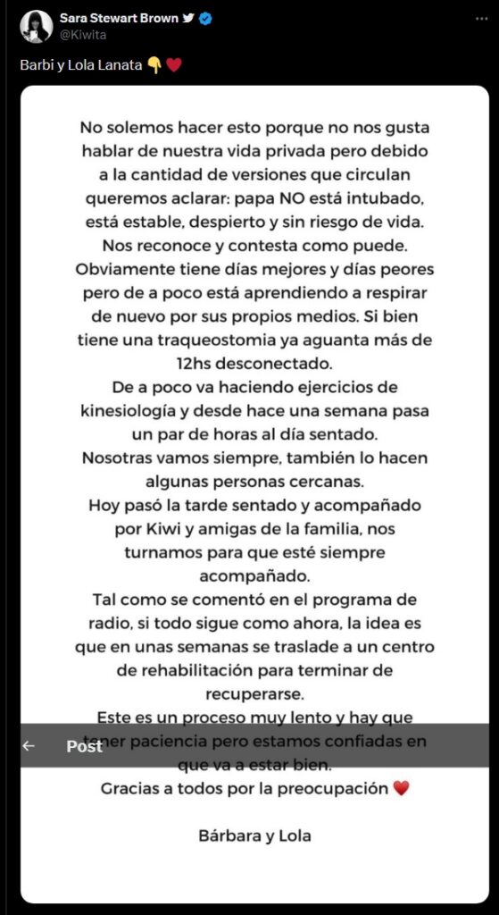 En su mensaje, señalaron: “Nos reconoce y contesta como puede. Obviamente tiene días mejores y días peores, pero de a poco está aprendiendo a respirar por sus propios medios.” Además, destacaron que, aunque Lanata tiene una traqueostomía, ya logra estar desconectado por más de 12 horas y realiza ejercicios de kinesiología, mostrando señales de mejora.