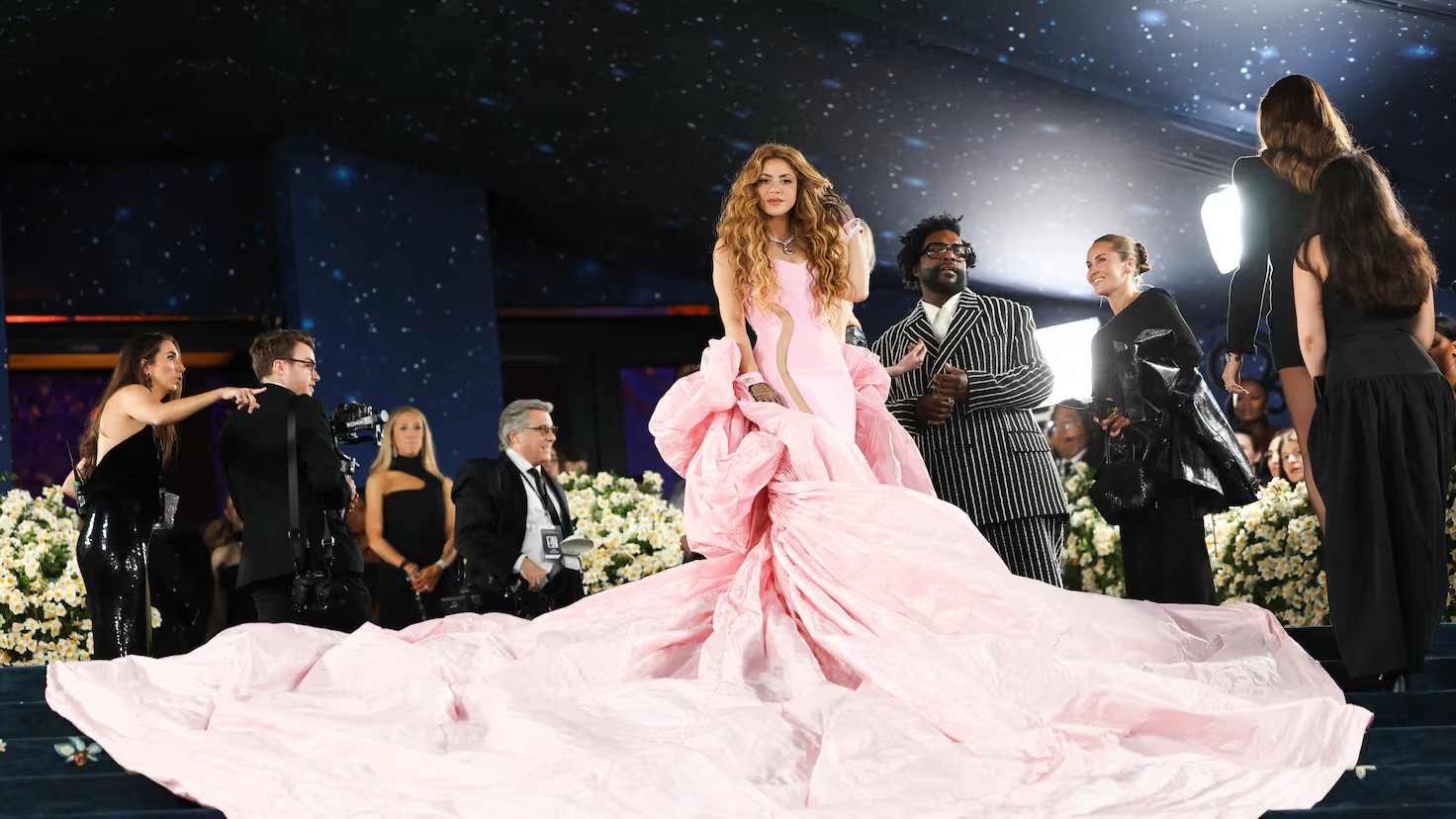 El rosa se ha convertido en el amuleto de la artista para este 2025 con un diseño en color rosa Barbie firmado por Prabal Gurung.