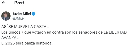 El presidente Javier Milei apuntó contra la casta luego que los senadores se aumentaran el sueldo y destacó que los únicos que votaron en contra de la iniciativa fueron de su espacio, La Libertad Avanza.