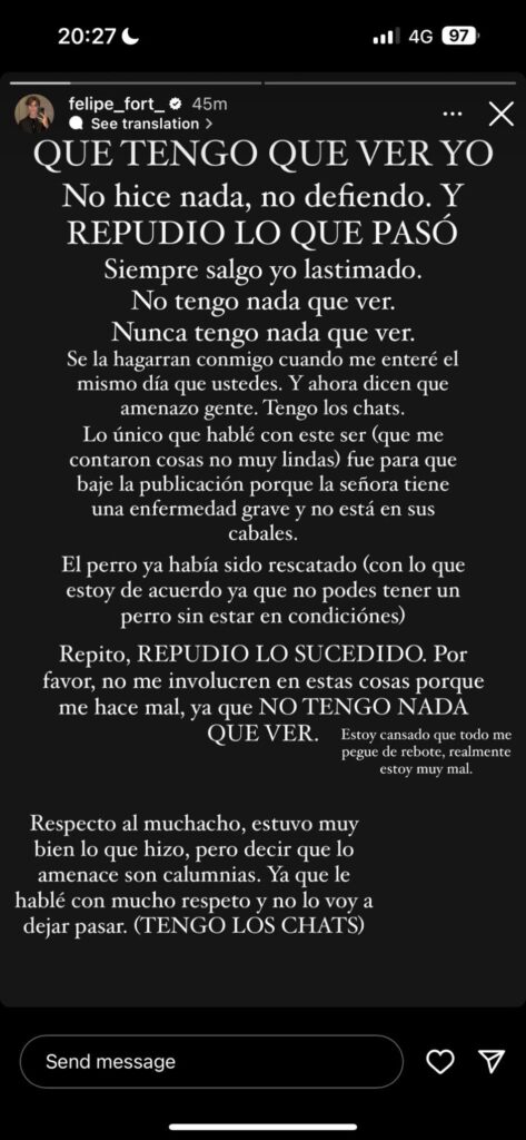 Durante la entrevista, Ezequiel compartió que la familia de la mujer está intentando recuperar al perro a toda costa. Cuando Soledad Larghi le preguntó si era cierto que recibió “un apriete” de una figura famosa, el rescatista admitió que sí, e incluso mostró los mensajes que recibió por Instagram de Felipe, hijo del recordado Ricardo Fort.