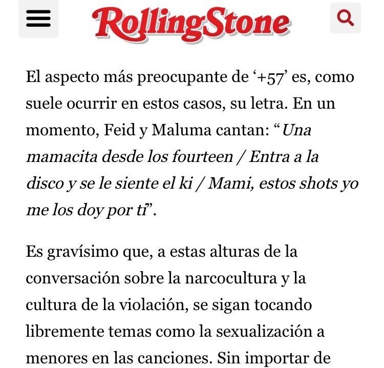 En su artículo titulado “El desastre de ‘+57′”, el crítico Martín Toro señala que, especialmente en una parte de la canción donde Feid y Maluma cantan sobre una joven de “catorce” años, la letra refuerza la cultura de la violación que se ha vinculado con la ciudad de Medellín. La frase “Una mamacita desde los catorce (catorce) / Entra a la disco y se le siente el ki” ha sido especialmente señalada, ya que se hace referencia explícita a la atracción hacia menores, lo que, según Toro, normaliza y perpetúa la sexualización de niñas en un contexto que está lejos de ser adecuado.