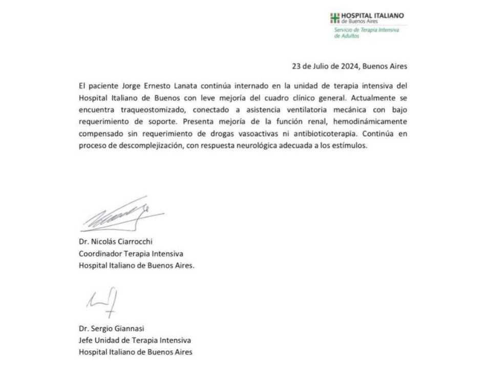 Según el informe, Lanata está “conectado a asistencia ventilatoria mecánica, con bajo requerimiento de soporte” y muestra una “mejoría de la función renal.” Además, está hemodinámicamente compensado sin necesidad de drogas vasoactivas ni antibioticoterapia, y continúa en proceso de descomplejización, con respuesta neurológica adecuada a los estímulos.
