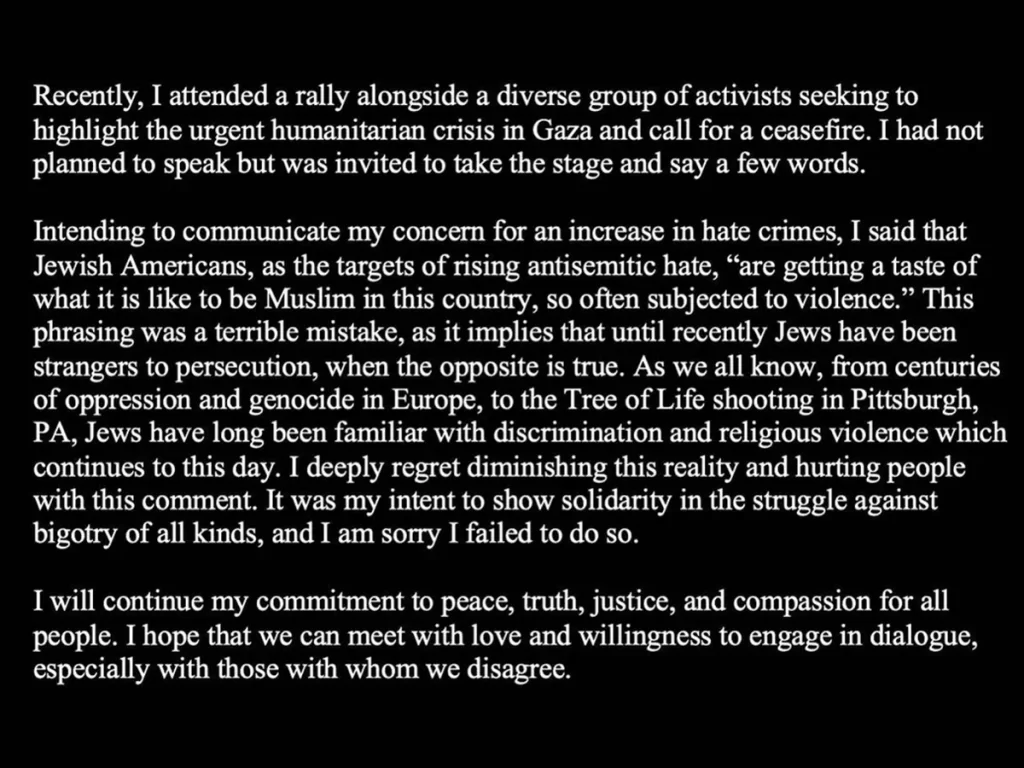 Señaló que la controvertida frase que utilizó implicaba falsamente que los judíos no han enfrentado persecución. Luego destacó siglos de opresión y genocidio judío en Europa, así como el tiroteo del Árbol de la Vida en Pittsburgh, Pensilvania.