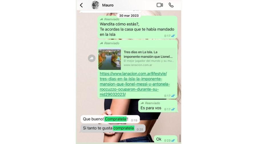 Los nuevos mensajes filtrados muestran cómo Icardi, en una conversación del 30 de marzo de 2023, se burla de la casa que Wanda había soñado comprar. En este chat, la empresaria le envía a Mauro un enlace sobre la mansión donde Antonela Roccuzzo y Lionel Messi se hospedaron en Buenos Aires, a lo que Icardi responde de manera sarcástica: “Que bueno. Compratela. Si tanto te gusta, compratela”. Wanda, de forma tajante, le responde: “Ok”.